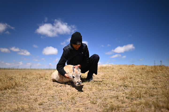 “白靈,快過(guò)來(lái)?!彪S著(zhù)一聲呼喚,一只1歲齡的雄性藏羚羊跑到巡山隊員扎西桑周的身邊,用長(cháng)了小羊角的腦袋蹭蹭他的腿。