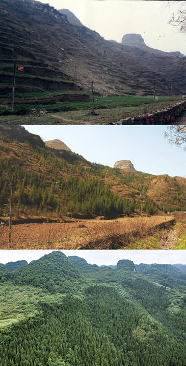 這是一張拼版照片,從上至下分別為:畢節市大方縣羊場(chǎng)鎮穿巖村沙壩退耕還林前的坡耕地(資料照片,大方縣林業(yè)局供圖);2009年3月14日拍攝的畢節市大方縣羊場(chǎng)鎮穿巖村沙壩退耕還林實(shí)施過(guò)程中的坡耕地(大方縣林業(yè)局供圖);2022年6月2日拍攝的畢節市大方縣羊場(chǎng)鎮穿巖村沙壩風(fēng)貌(新華社記者陶亮攝)。新華社發(fā)