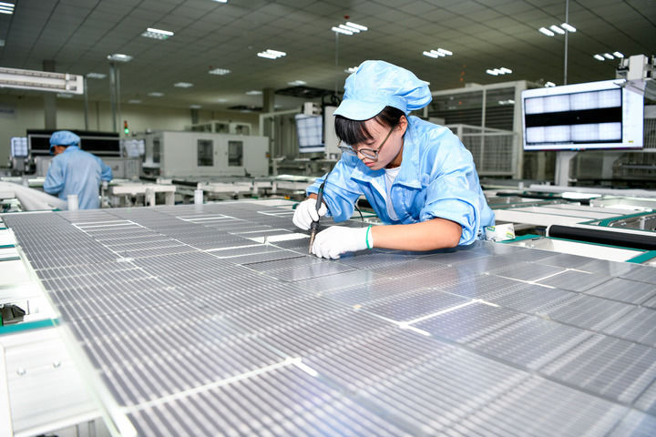 工人在位于貴州威寧經(jīng)濟開(kāi)發(fā)區的貴州一道長(cháng)通新能源有限公司生產(chǎn)太陽(yáng)能光伏組件(7月19日攝)。新華社記者 楊文斌 攝