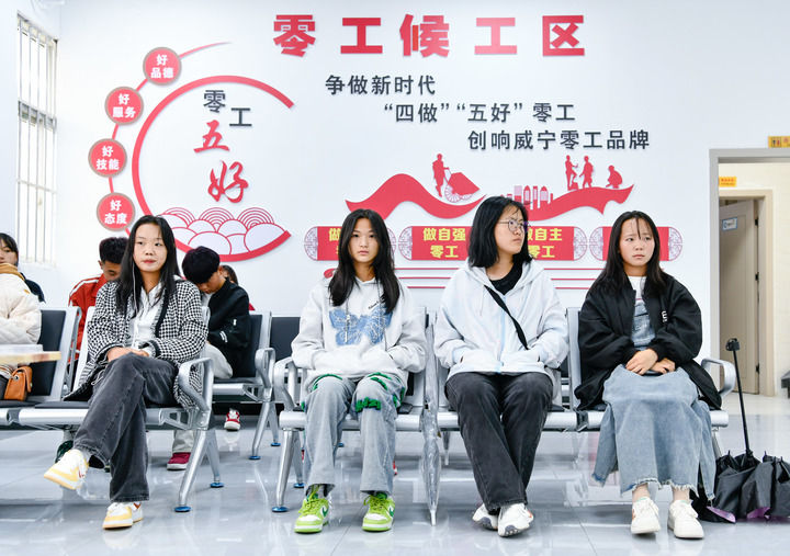 職業(yè)學(xué)校的學(xué)生在貴州省威寧縣人力資源服務(wù)產(chǎn)業(yè)園等待招聘會(huì )開(kāi)始(7月19日攝)。新華社記者 楊文斌 攝