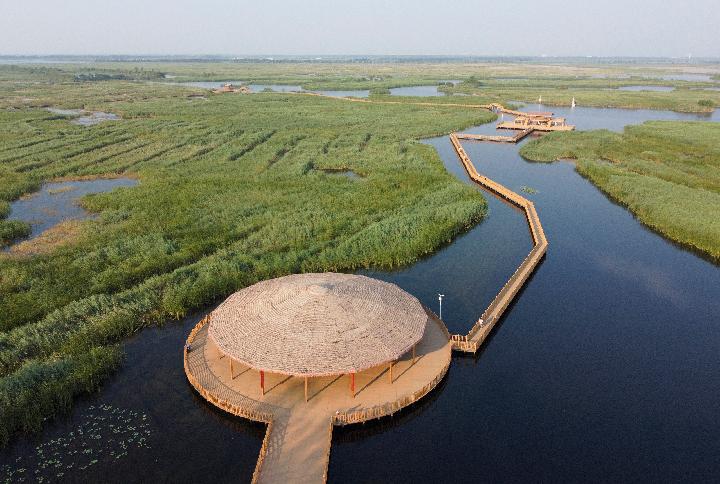 這是7月19日拍攝的白洋淀木棧道(無(wú)人機照片)。新華社記者郝建偉 攝