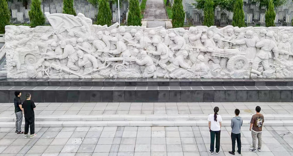 2023年7月13日,游客在吉林省集安市革命烈士陵園內觀(guān)看抗美援朝烈士浮雕紀念墻(無(wú)人機照片) 。新華社記者 周萬(wàn)鵬 攝