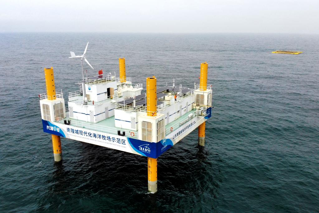 山東長(cháng)島綜合試驗區南隍城國家級海洋牧場(chǎng)示范區海上平臺(無(wú)人機照片)。新華社記者王凱 攝