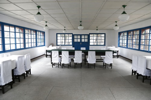這是2019年3月5日在朝鮮板門(mén)店拍攝的朝鮮戰爭停戰協(xié)定談判會(huì )場(chǎng)內景。新華社記者程大雨攝