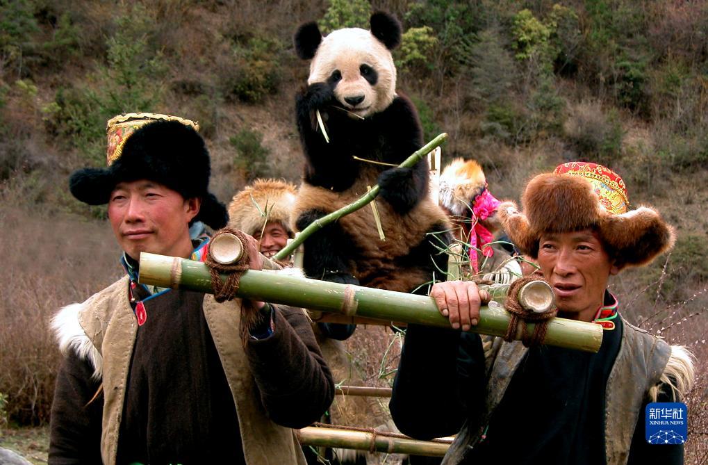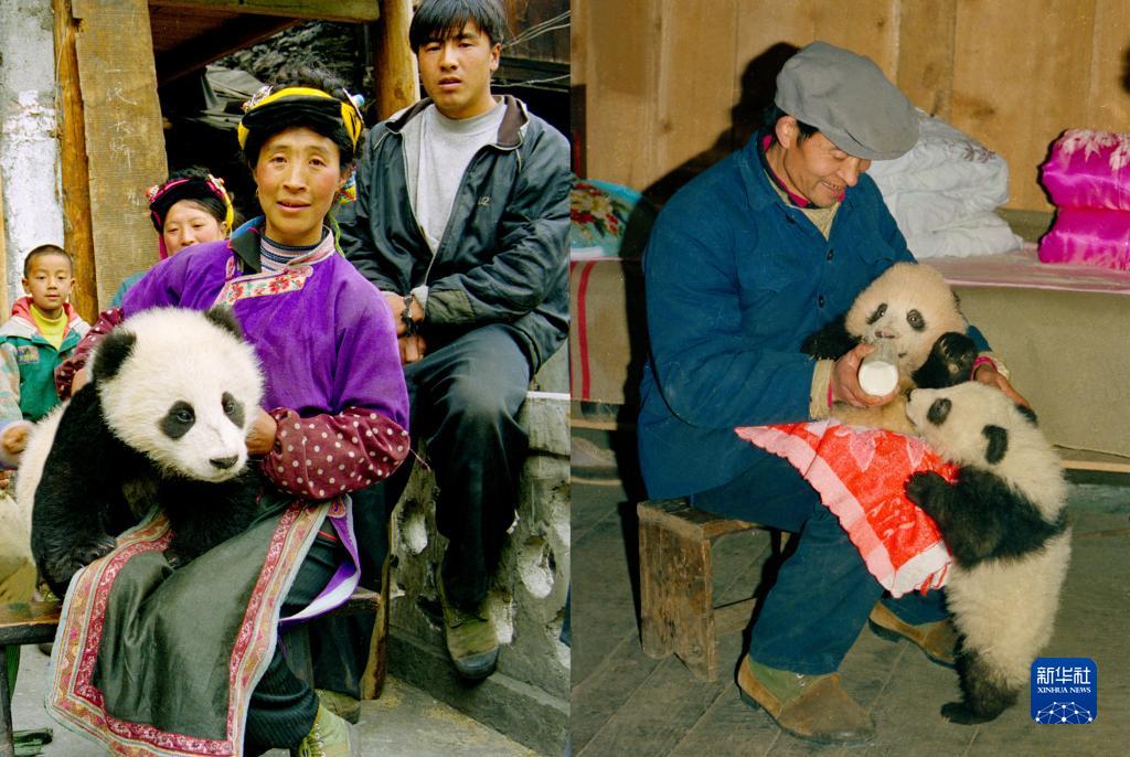 寶興縣村民與大熊貓和諧共處(資料照片,攝于20世紀)。新華社發(fā)(寶興縣委宣傳部供圖)