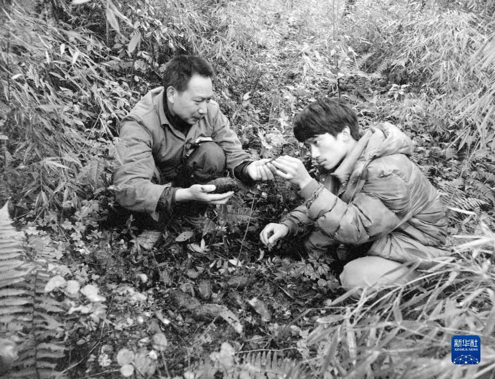 “中國大熊貓之父”胡錦矗(左)和時(shí)任“五一棚”監測站負責人王鵬彥(右)一起分析大熊貓的糞團,尋找它們的活動(dòng)蹤跡,以準確地投放補充飼料(資料照片)。新華社記者 金勖琪 攝