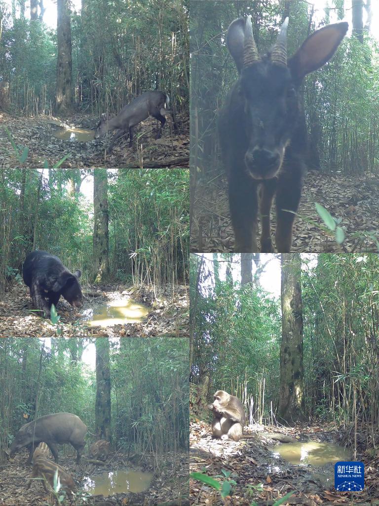 大熊貓國家公園滎經(jīng)片區紅外相機拍攝到的野生動(dòng)物:毛冠鹿(左上)、黑熊(左中)、野豬(左下)、中華鬣羚 (右上)、藏酋猴(右下)。新華社發(fā)