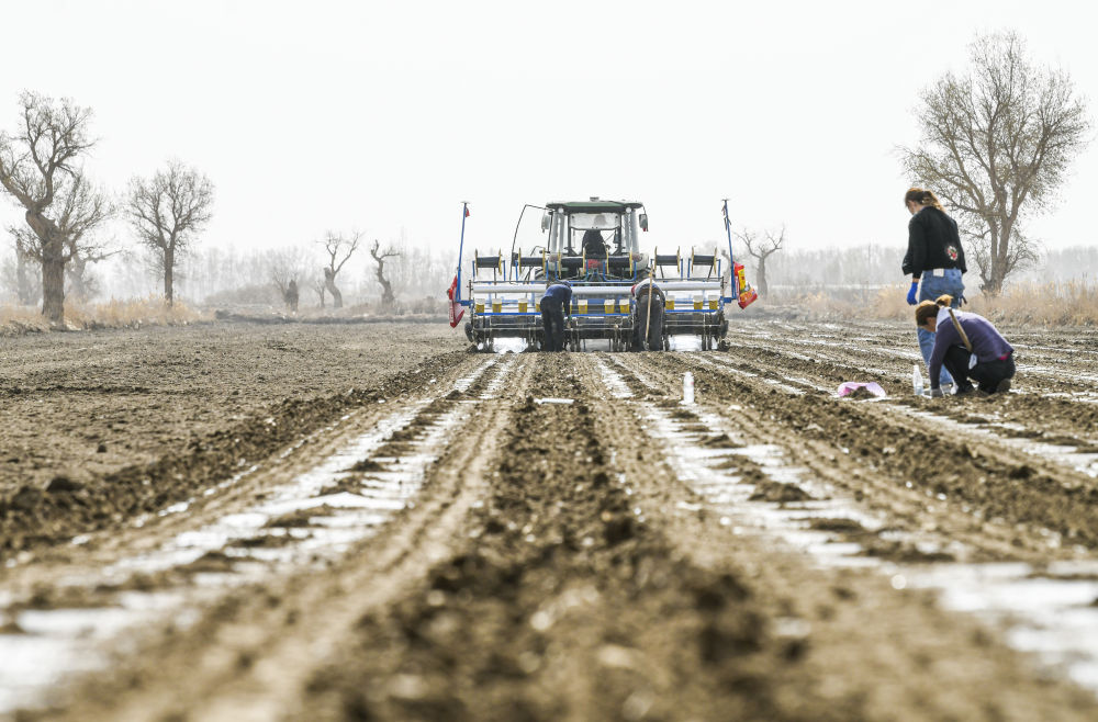 搭載北斗導航系統的播種機在新疆尉犁縣的棉田作業(yè),棉農在其后查看播種情況(3月30日攝)。新華社記者 王菲 攝