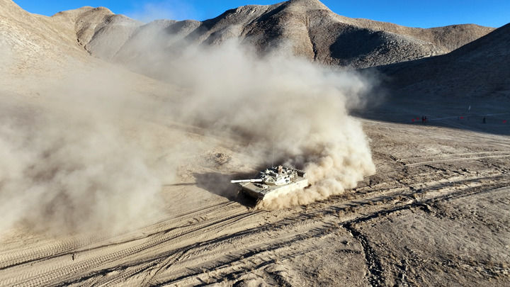 在海拔4000米的野外訓練場(chǎng),西藏軍區某旅坦克分隊展開(kāi)復雜山地路段駕駛機動(dòng)考核(2023年1月3日攝)。新華社發(fā)(曹智 攝)