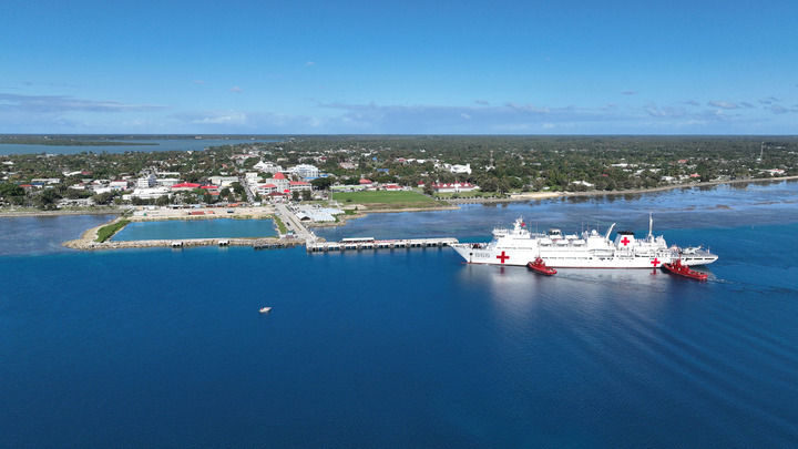 2023年7月28日,執行“和諧使命-2023”任務(wù)的中國海軍“和平方舟”號醫院船抵達湯加王國努庫阿洛法港(無(wú)人機照片)。新華社發(fā)(桂江波 攝)