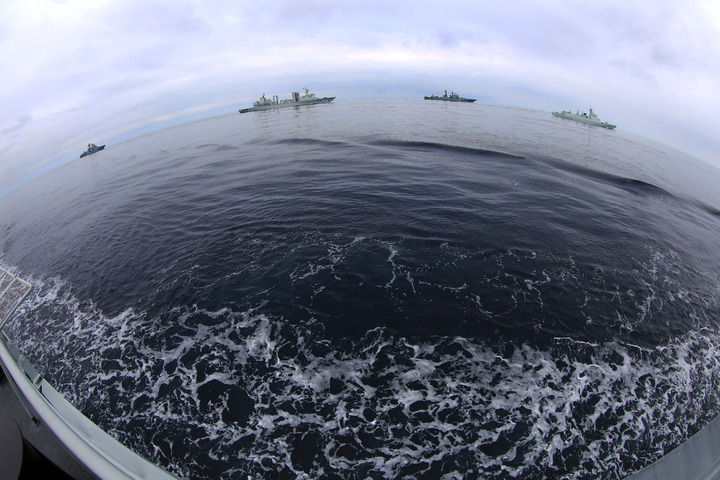在日本海某海域進(jìn)行的“北部·聯(lián)合-2023”演習中,中俄雙方艦艇編隊航行(2023年7月20日攝)。新華社發(fā)(張海龍 攝)