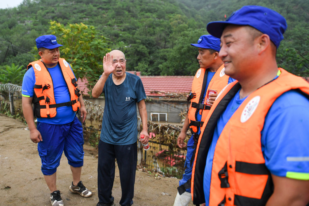 8月1日,在北京市門(mén)頭溝區水峪嘴村,一名87歲的村民向助他脫困的河北秦皇島獵豹救援隊隊員表示感謝。新華社記者 鞠煥宗 攝