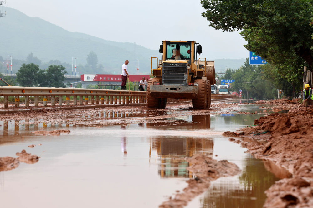 7月31日,在河北省石家莊市井陘縣307國道長(cháng)崗村段,防汛工作人員駕駛機械清理淤泥。新華社發(fā)(梁子棟攝)