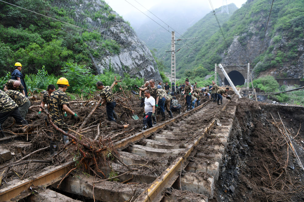 8月1日,在北京市門(mén)頭溝區水峪嘴村附近一段被阻斷的鐵路線(xiàn)上,中鐵六局的工作人員在清理軌道上的雜物,全力恢復交通。新華社記者 鞠煥宗 攝