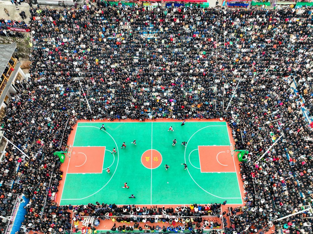 這是2023年3月27日在黔東南州臺江縣臺盤(pán)村拍攝的貴州省首屆“美麗鄉村”籃球聯(lián)賽總決賽比賽現場(chǎng)(無(wú)人機照片)。新華社記者 歐東衢 攝
