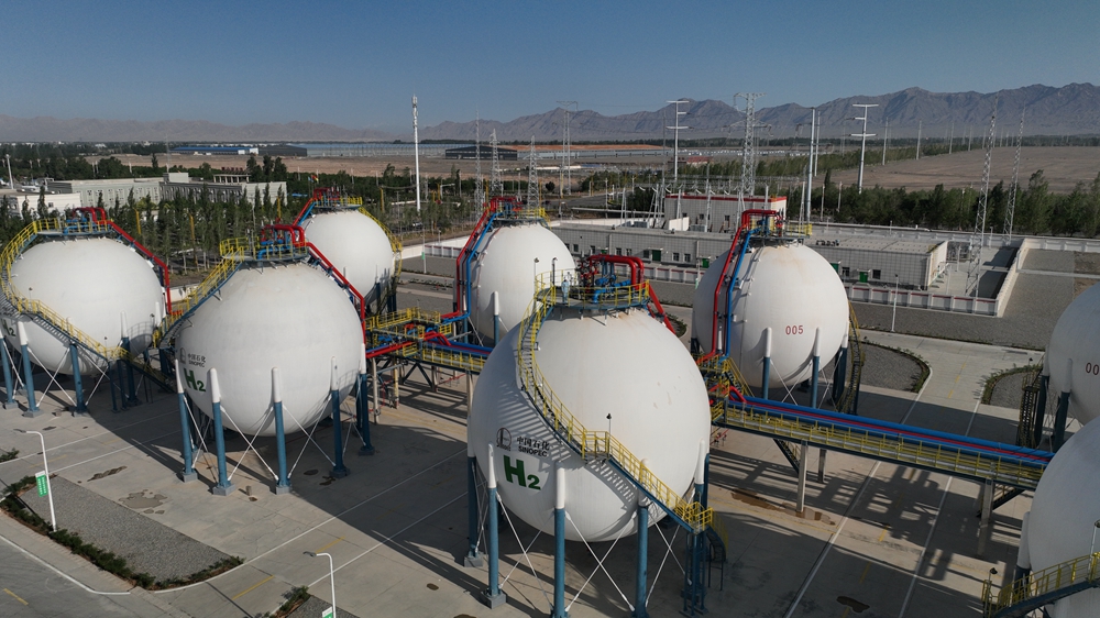 這是2023年6月30日拍攝的中國石化新疆庫車(chē)綠氫示范項目制氫廠(chǎng)儲氫罐區(無(wú)人機照片)。新華社記者 顧煜 攝