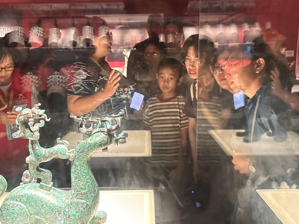 7月21日,游客在河南博物院觀(guān)看春秋時(shí)期神獸造型的樂(lè )器支架。(新華社記者翟翔 攝)