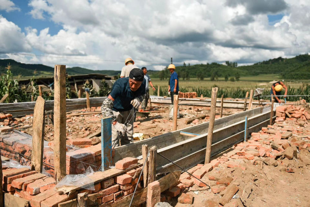 工作人員對吉林省舒蘭市開(kāi)原鎮模范村的受損房屋進(jìn)行拆除重建工作(8月16日攝)。新華社記者 許暢 攝