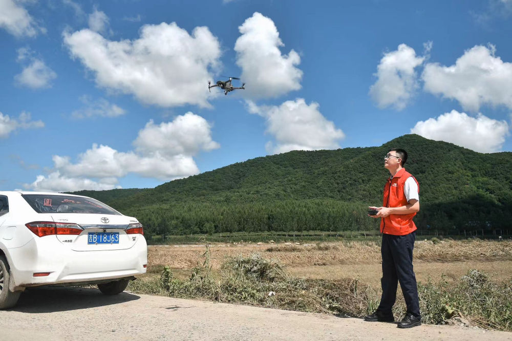 農業(yè)保險理賠人員使用無(wú)人機查看吉林省舒蘭市金馬鎮周邊農田受災情況(8月15日攝)。新華社記者 許暢 攝