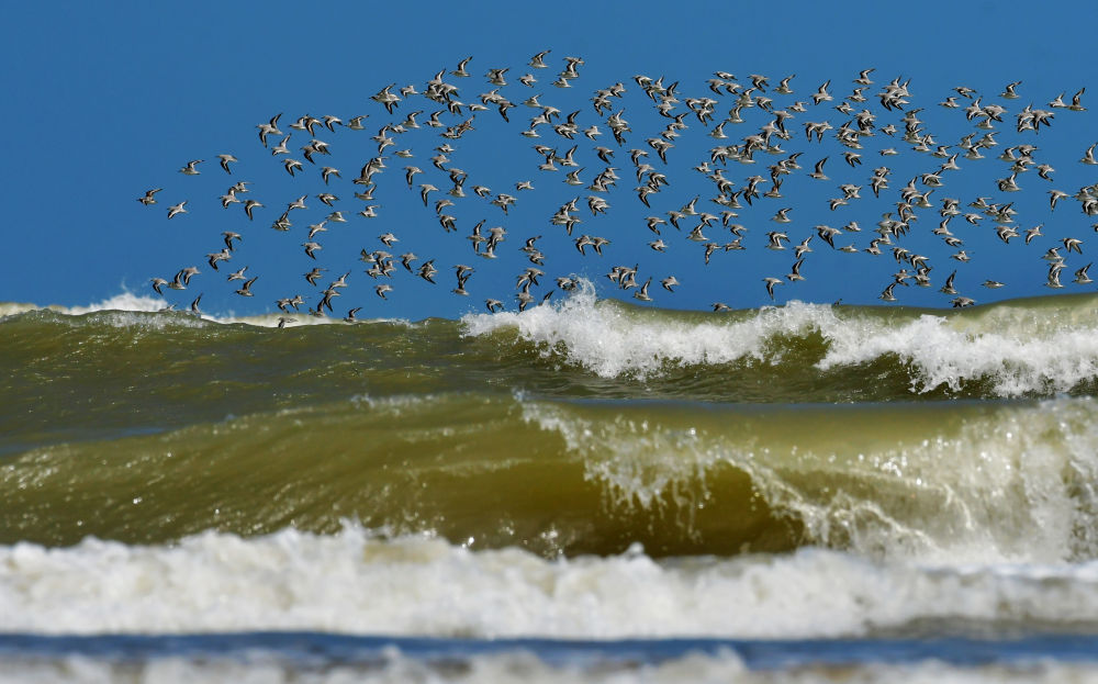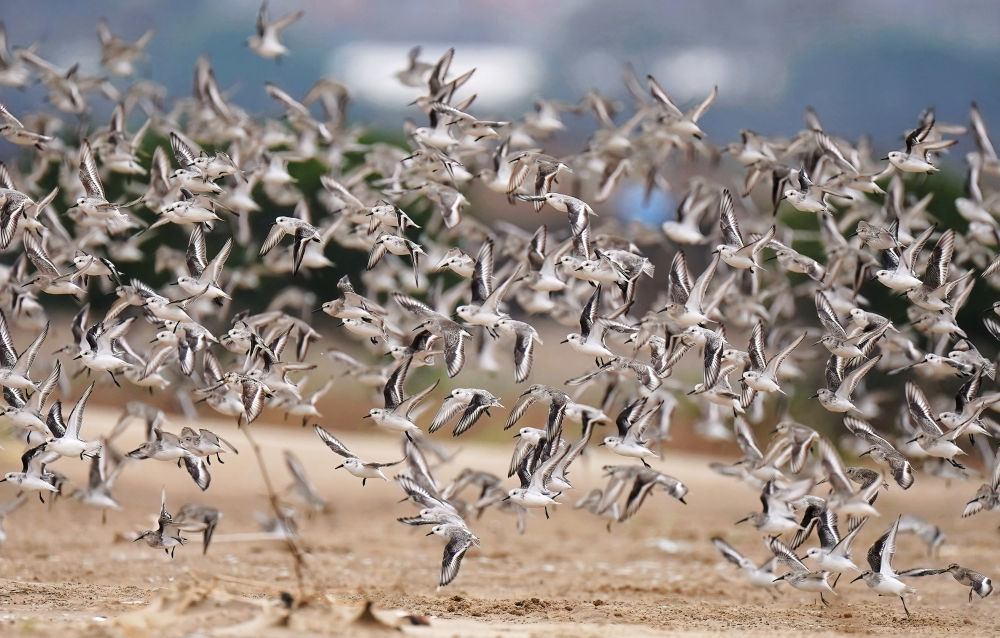 一群鳥(niǎo)飛越閩江河口濕地國家級自然保護區沙灘(2022年11月13日攝)。新華社記者 魏培全 攝