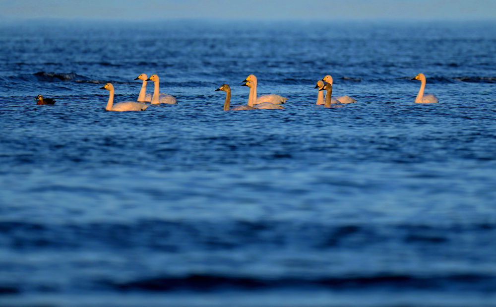 一群小天鵝在閩江河口濕地國家級自然保護區海面上覓食(2023年1月31日攝)。新華社記者 魏培全 攝