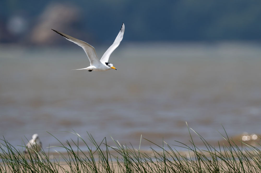 被譽(yù)為“神話(huà)之鳥(niǎo)”的中華鳳頭燕鷗掠過(guò)閩江河口濕地國家級自然保護區核心區沙灘(2023年6月25日攝)。新華社記者 魏培全 攝