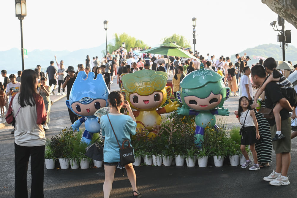 游客在位于杭州西湖景區的斷橋邊與杭州亞運會(huì )吉祥物合影(2023年8月21日攝)。新華社記者 黃宗治 攝