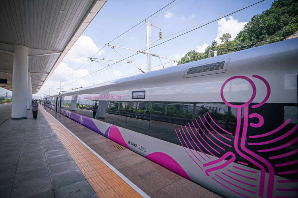 這是亞運智能動(dòng)車(chē)組??吭诘虑逭菊九_(2023年8月4日攝)。新華社記者 江漢 攝