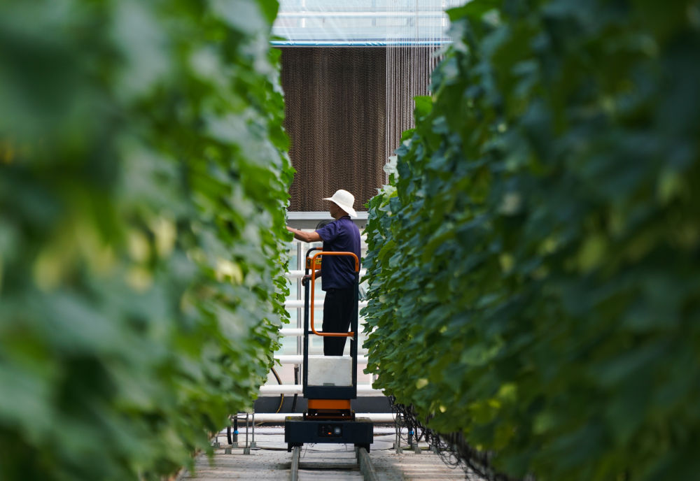 2023年7月26日,在山東濰坊壽光市丹河設施蔬菜標準化生產(chǎn)示范園,農民在管護作物。新華社記者 張浩波 攝