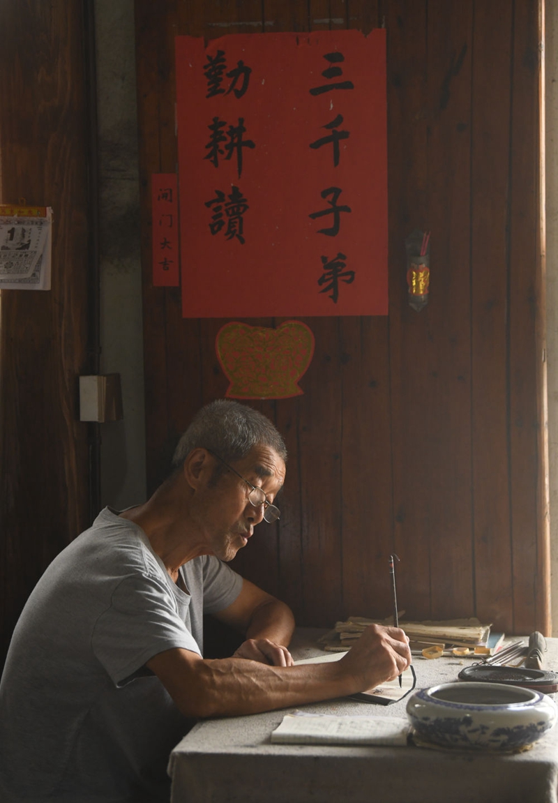 諸葛村的村民在家中寫(xiě)扇面(2023年8月1日攝)。新華社記者 翁忻旸 攝