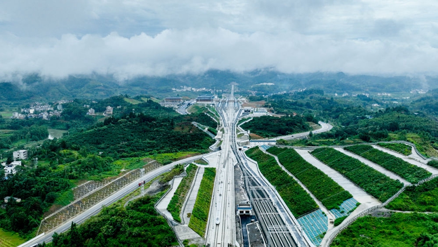 試驗動(dòng)車(chē)組穿過(guò)長(cháng)達17公里的九萬(wàn)大山一號隧道(8月23日攝,無(wú)人機照片)。新華社記者 歐東衢 攝