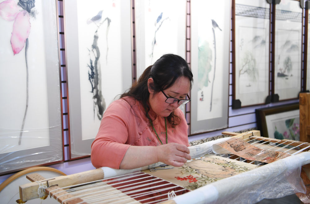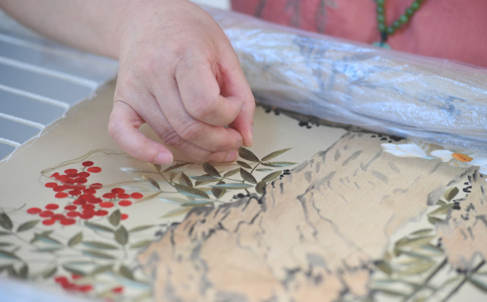 國家級非遺保護項目汴繡傳承人程芳在制作汴繡作品(2023年6月20日攝)。新華社記者 張浩然 攝