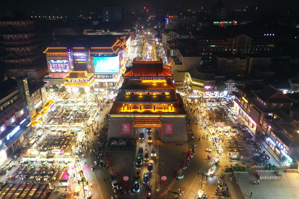 開(kāi)封鼓樓夜市(2023年6月20日攝,無(wú)人機照片)。新華社記者 張浩然 攝
