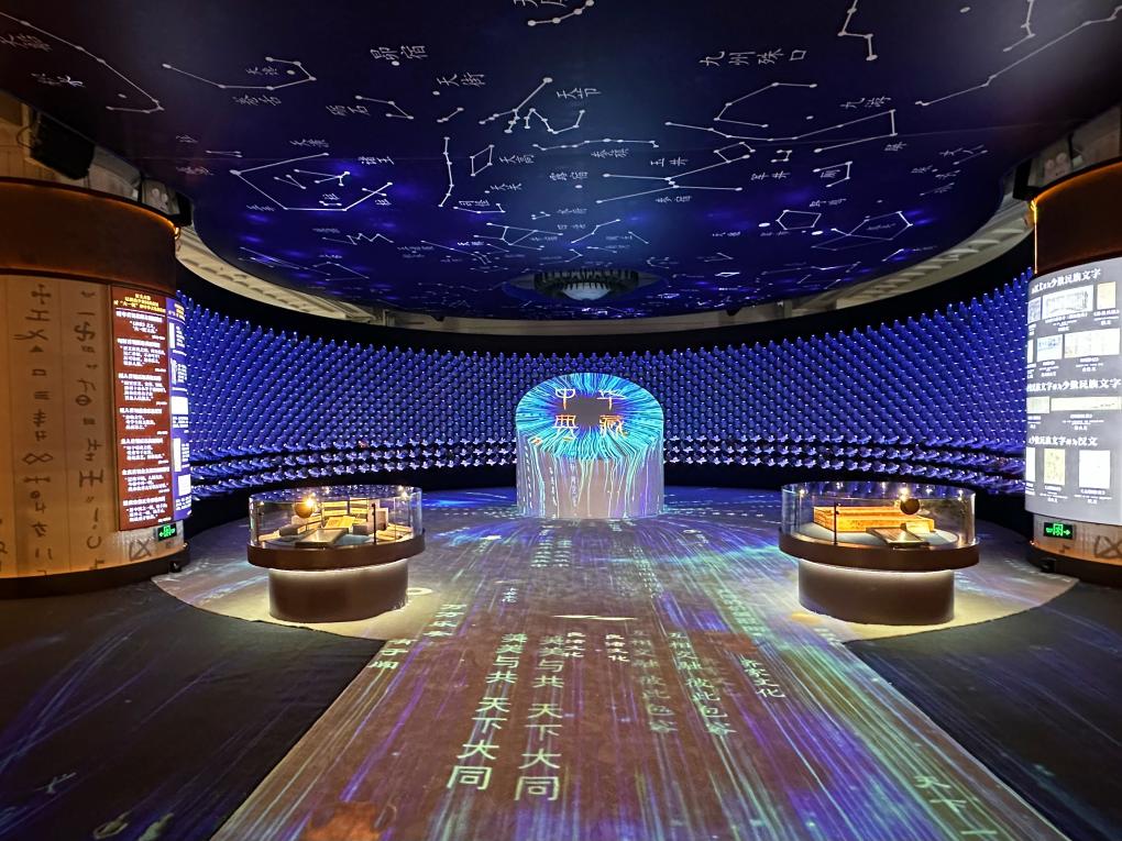 ——更沉浸。走進(jìn)展廳,頭頂上方是古天文圖、古絲綢之路地圖,腳下則是流淌著(zhù)一行行經(jīng)典語(yǔ)錄的“中華文明之河”和“民族走廊”。