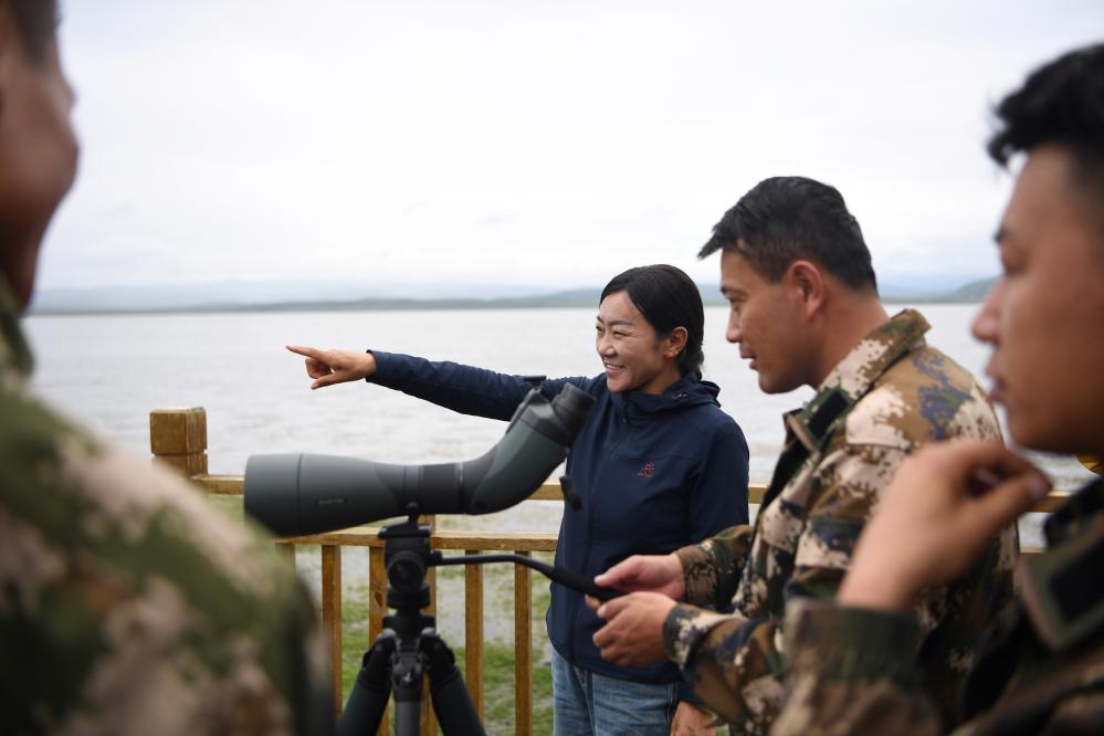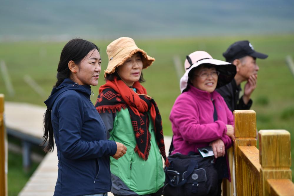甘肅尕海則岔國家級自然保護區管護中心尕海保護站站長(cháng)香毛吉(左一)向游客介紹保護區的野生動(dòng)植物情況。 新華社記者 陳斌 攝
