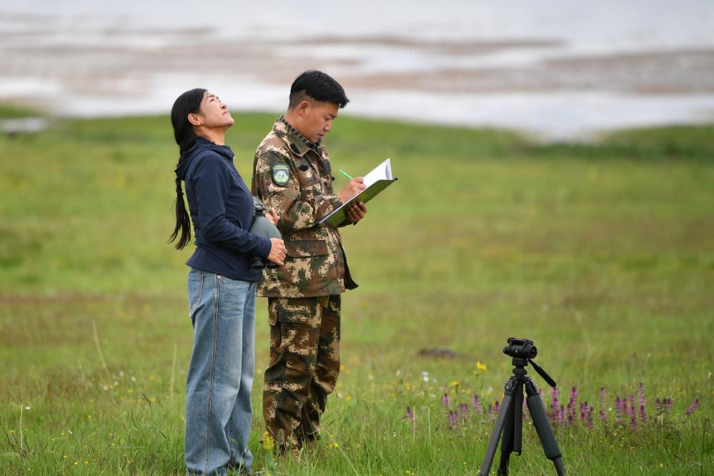 甘肅尕海則岔國家級自然保護區管護中心尕海保護站站長(cháng)香毛吉(左一)和同事在保護區內用望遠鏡觀(guān)測野生動(dòng)物。 新華社記者 陳斌 攝
