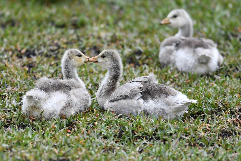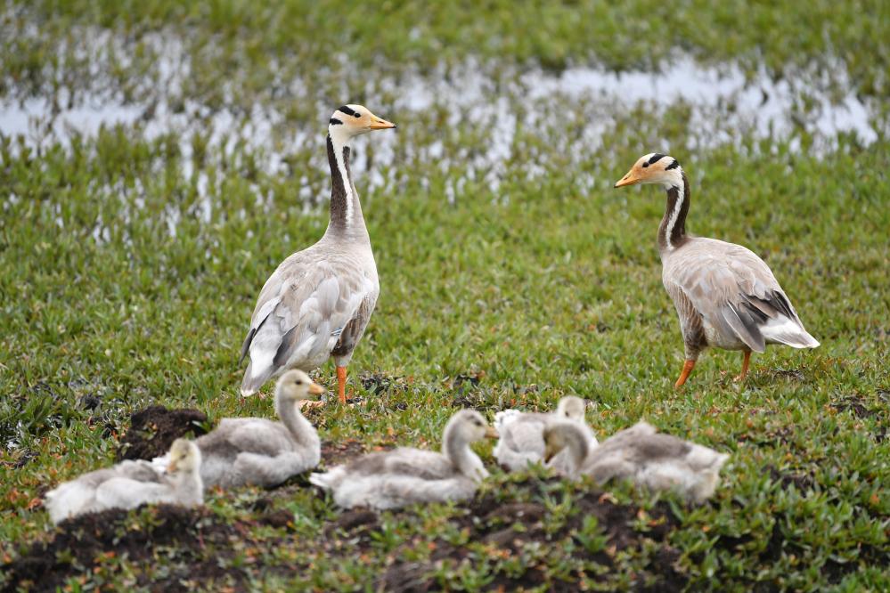 斑頭雁幼鳥(niǎo)在甘肅尕海則岔國家級自然保護區的尕海濕地嬉戲。 新華社記者 陳斌 攝