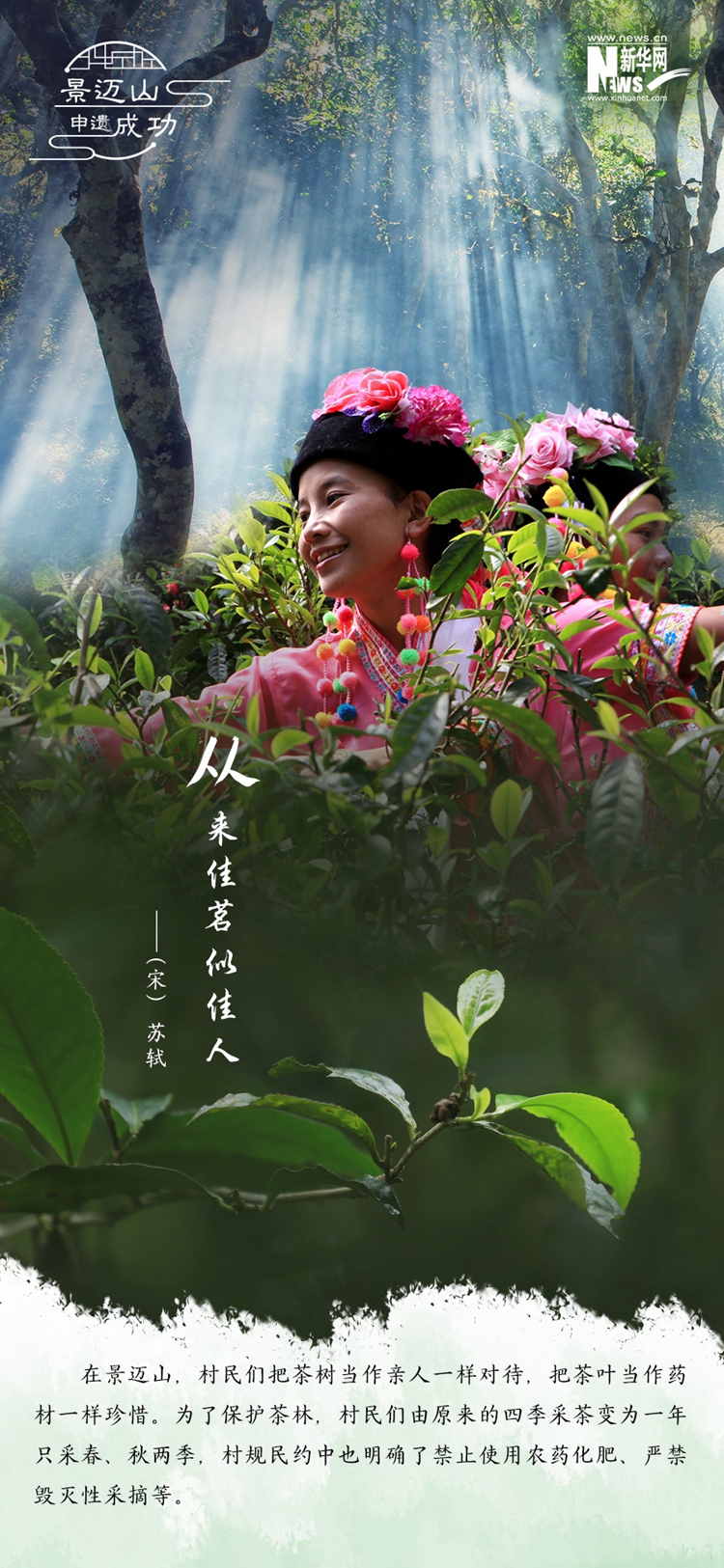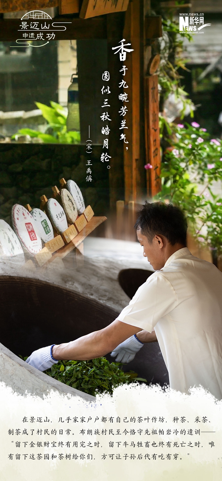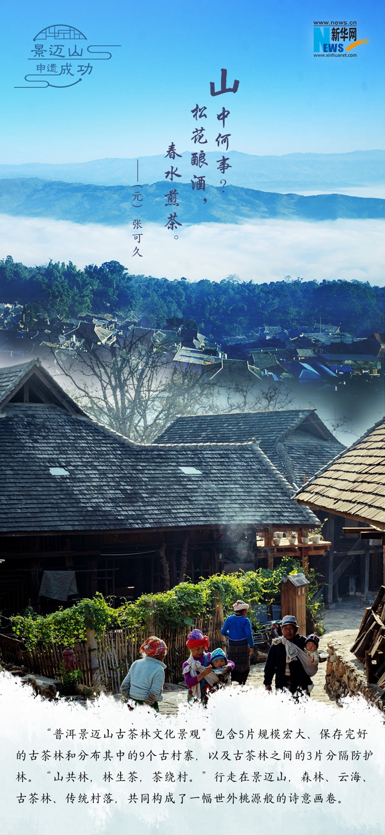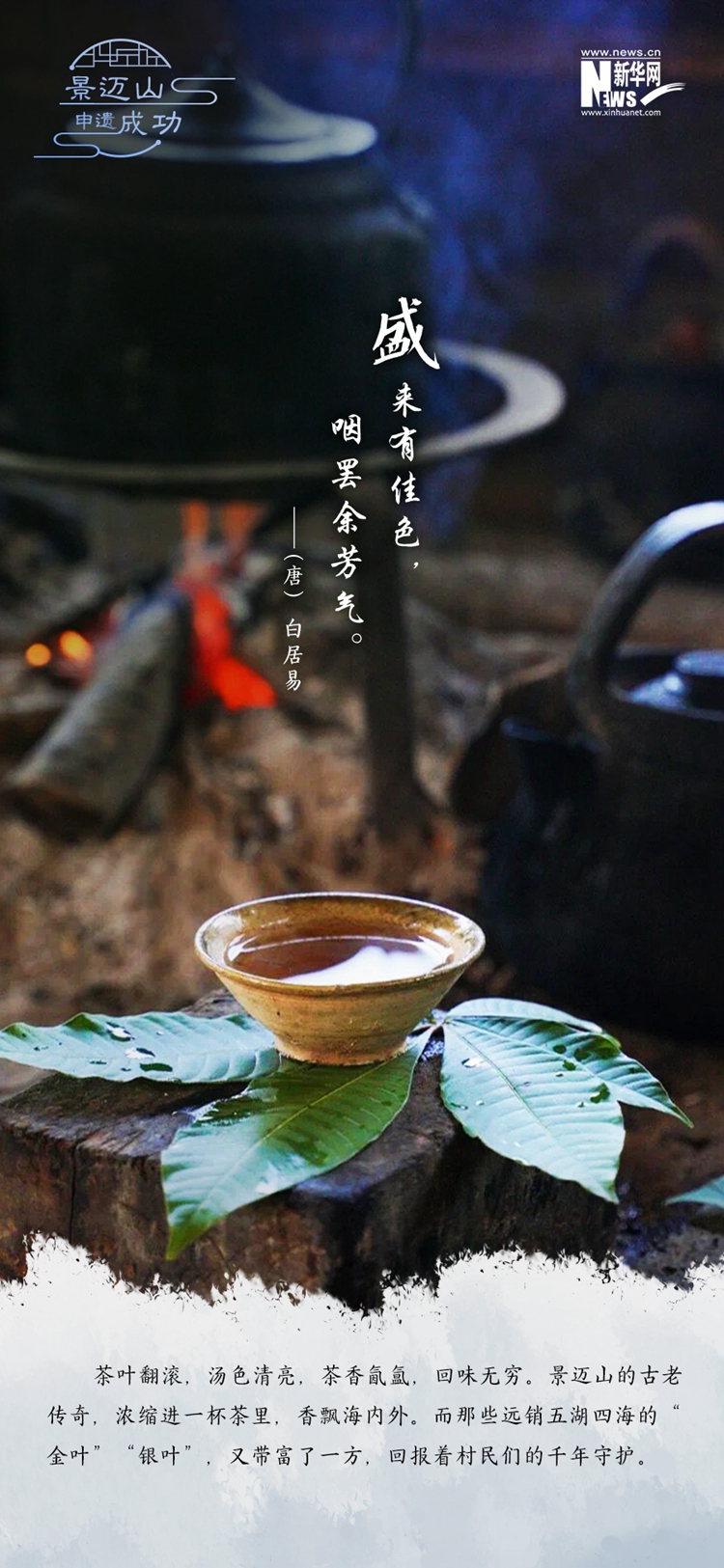 千百年來(lái),生活在景邁山的布朗族、傣族先民以古茶林為核心,對山區土地集約利用和合理布局,創(chuàng )造了“茶在林中”“村在茶中”“人茶共生”的智慧型山地人居環(huán)境。景邁山的古老傳奇,濃縮進(jìn)一杯茶里,香飄海內外。而那些遠銷(xiāo)五湖四海的“金葉”“銀葉”,又帶富了一方,回報著(zhù)村民們的千年守護。
