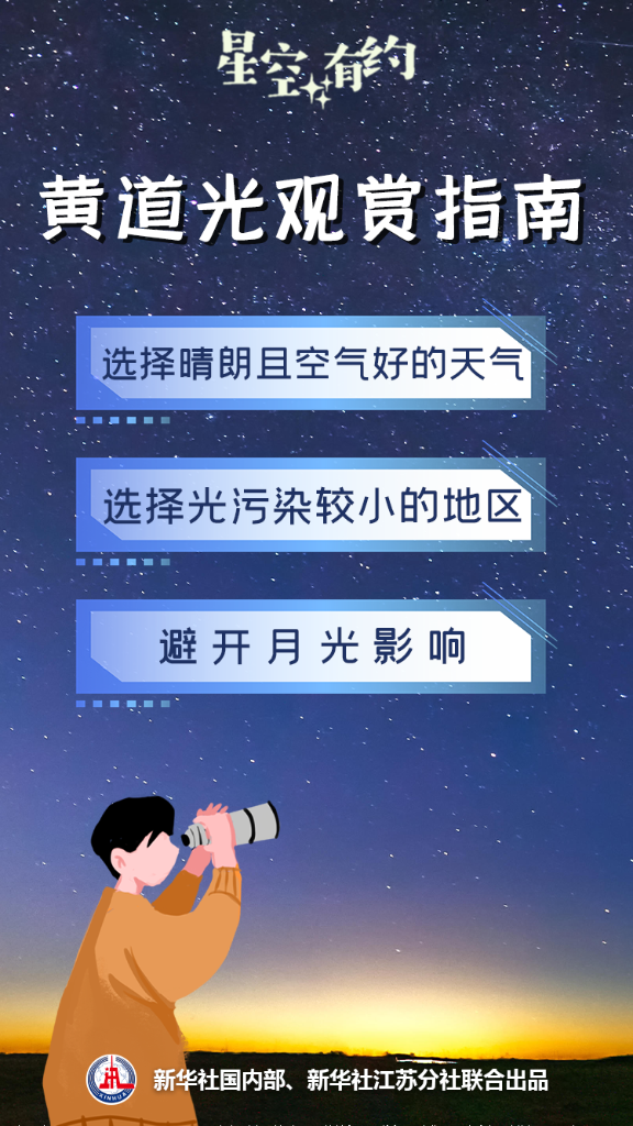 觀(guān)賞黃道光有一定技巧。王科超建議,首先應盡量選擇晴朗且空氣質(zhì)量良好的天氣觀(guān)賞,這時(shí)大氣透明度較高。其次,應選擇光污染較小的地區觀(guān)賞。第三,還要避開(kāi)月光的影響。今年秋分前后幾天,月光不會(huì )對觀(guān)測產(chǎn)生影響,對觀(guān)賞非常有利。