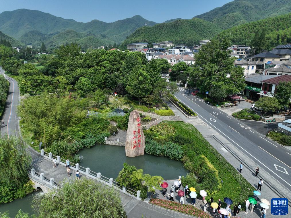 8月11日,游客在安吉余村的綠水青山間參觀(guān)(無(wú)人機照片)。新華社記者 翁忻旸 攝