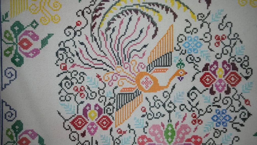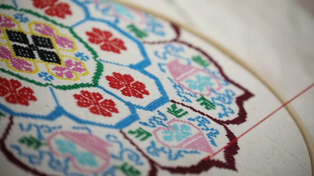 流行于陜西省漢中市城固縣一帶的城固架花,是陜西省非物質(zhì)文化遺產(chǎn)項目。城固架花以白土布作底,以十字陣法為基礎,以花包花、疊加、對稱(chēng)等獨特的表現手法,用針將五彩絲線(xiàn)繡在底布經(jīng)線(xiàn)和緯線(xiàn)交織的網(wǎng)格上,形成色彩絢麗、立體感強的圖案。