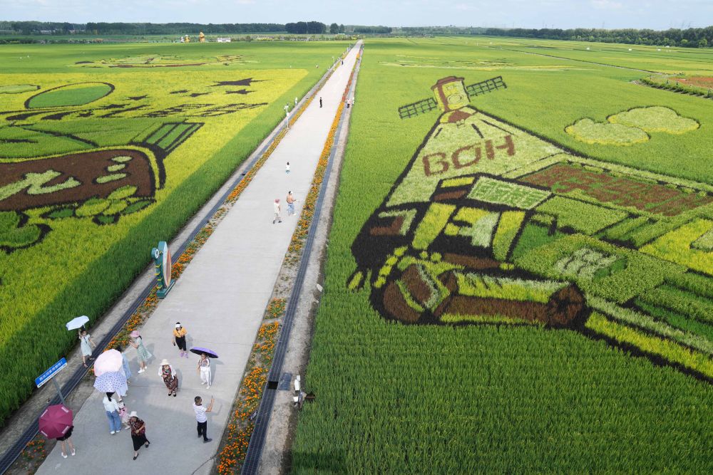 游客在北大荒集團閆家崗農場(chǎng)有限公司農業(yè)現代化示范區的稻田里游覽(2023年8月10日攝)。新華社記者 王建威 攝