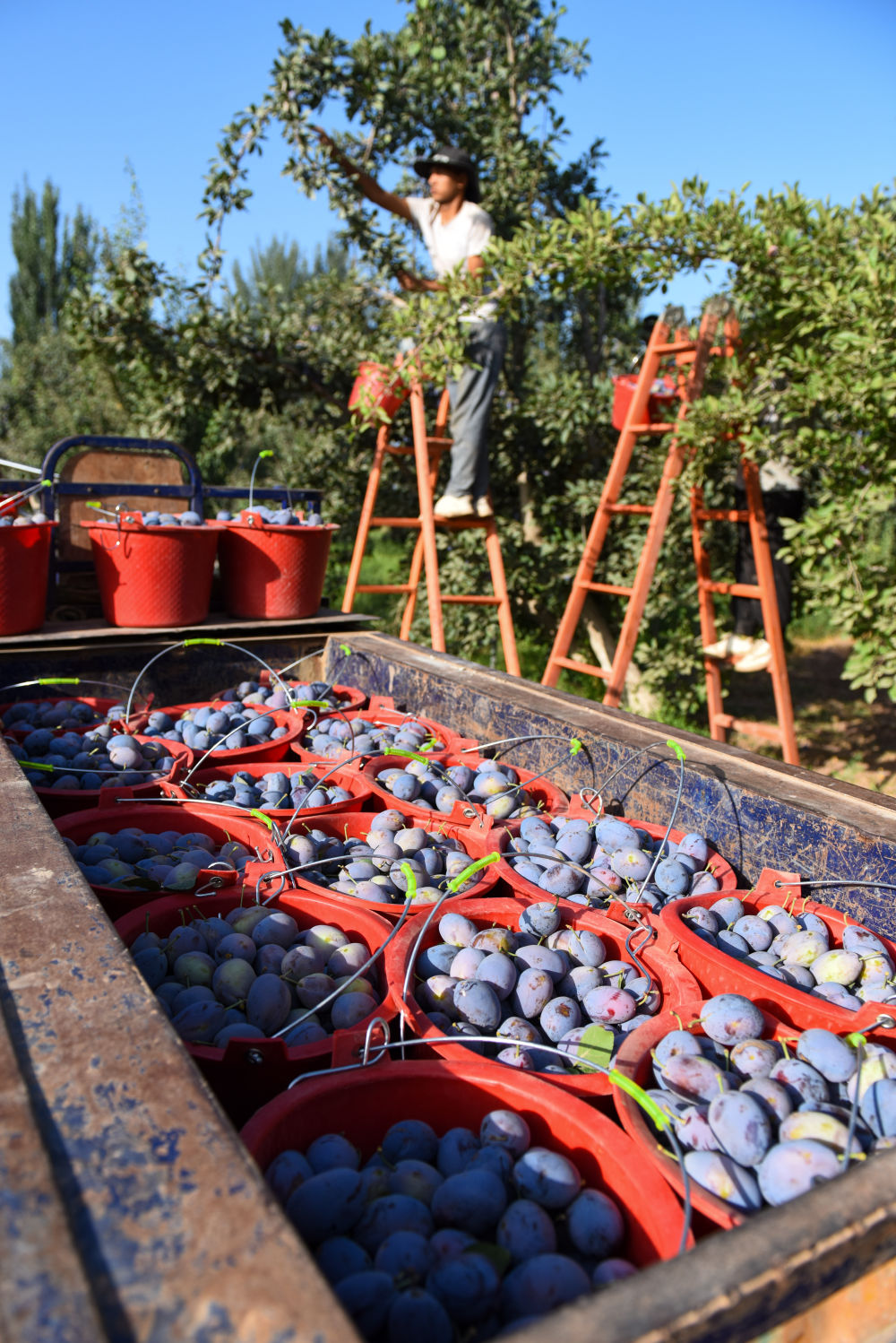 在新疆伽師縣英買(mǎi)里鎮巴格托格拉克村,果農在采摘新梅(2023年8月4日攝)。新華社記者 丁磊 攝