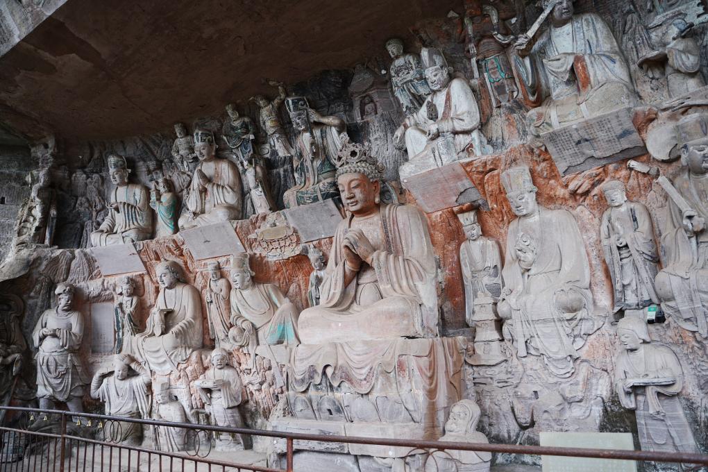 此外,記者注意到,毗盧洞景區的造像頂部搭建了鋼架棚,柳本尊“十煉”修行圖石窟上面外側還加修窟檐,水滴可直接落到地上而避免了順著(zhù)巖壁下流。景區內,工人們也正在加緊進(jìn)行二期保護項目的施工。