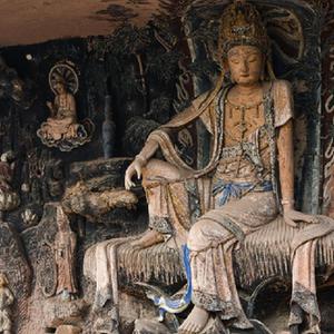 在毗盧洞景區,有一座聞名遐邇的“蹺腳觀(guān)音”造像:不同于常見(jiàn)的觀(guān)音造像,這座觀(guān)音左腳懸于臺外、右腳蹺起,隨意而坐,神態(tài)倜儻,顯得瀟灑自如,悠然自得?!败E腳而立,改變了北方石窟傳統造像正襟危坐、端莊典雅的形象,令人感到非常親民?!睏钚銈フf(shuō)。