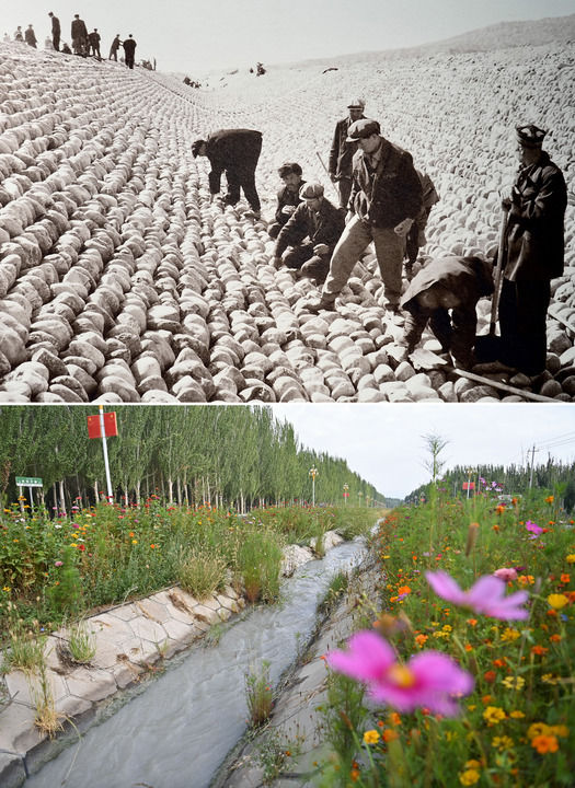這是一張拼版照片,上圖為20世紀80年代末,柯柯牙群眾用石頭鋪設防滲渠(資料照片);下圖為2023年9月1日拍攝的柯柯牙灌溉渠(新華社記者李響攝)。新華社發(fā)