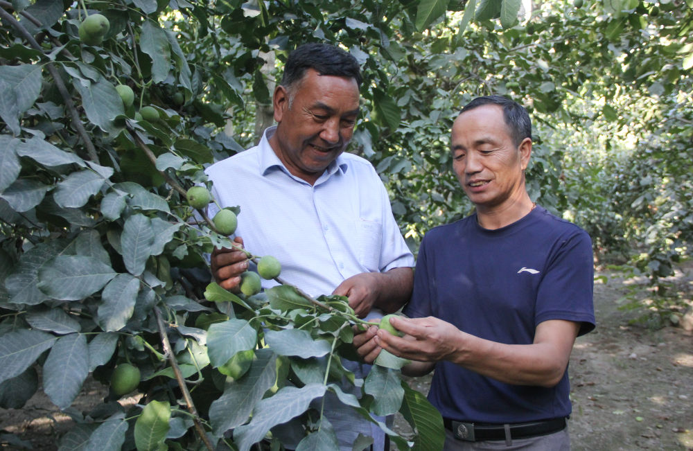 他倆是遠近聞名的“核桃兄弟”。20多年前,趙武中經(jīng)朋友介紹,從四川老家來(lái)到阿克蘇,免費承包了35畝荒地種核桃。起初,因為不懂技術(shù),樹(shù)苗成活率很低,加上碰到災害天氣,損失慘重。就在他打算放棄回老家時(shí),木合旦主動(dòng)借錢(qián)給他,還教他技術(shù),幫他渡過(guò)難關(guān)。兩人此后互幫互助、共同增收。