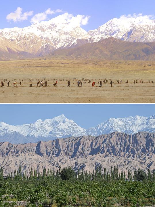 這是一張拼版照片,上圖為2006年,人們在柯柯牙植樹(shù)造林(資料照片);下圖為2023年8月30日拍攝的柯柯牙一處經(jīng)濟林(新華社記者李響攝)。新華社發(fā)