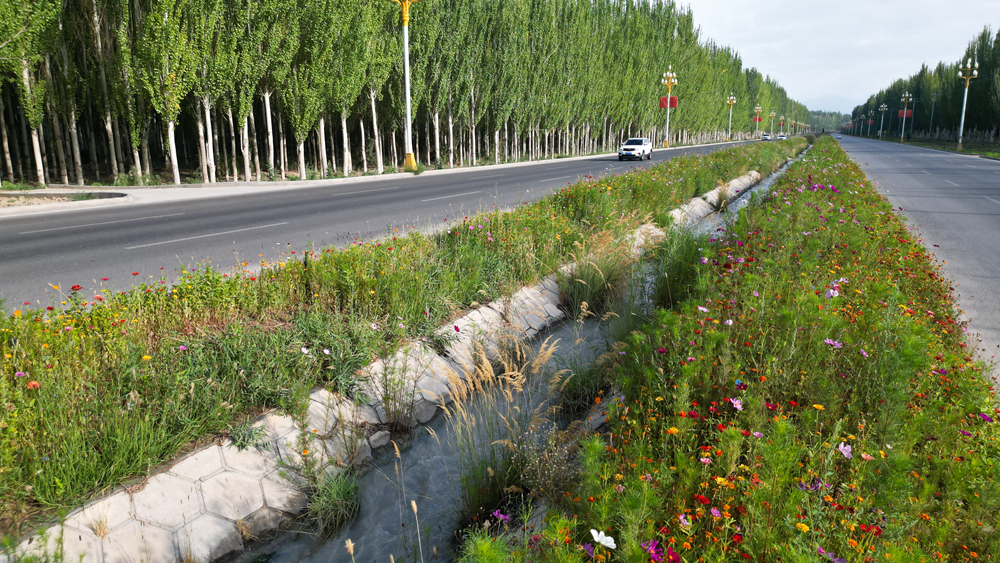 9月1日拍攝的柯柯牙路和柯柯牙灌溉渠(無(wú)人機照片)。新華社記者 李響 攝