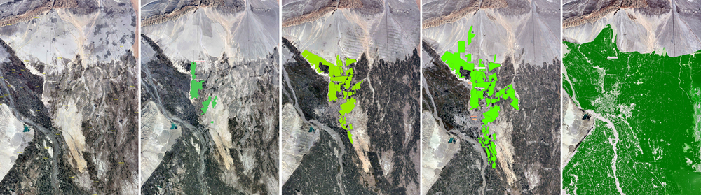 這是一張拼版照片,新疆柯柯牙荒漠綠化衛星遙感圖(從左至右分別為1986年、1996年、2006年、2012年、2022年)。新華社發(fā)